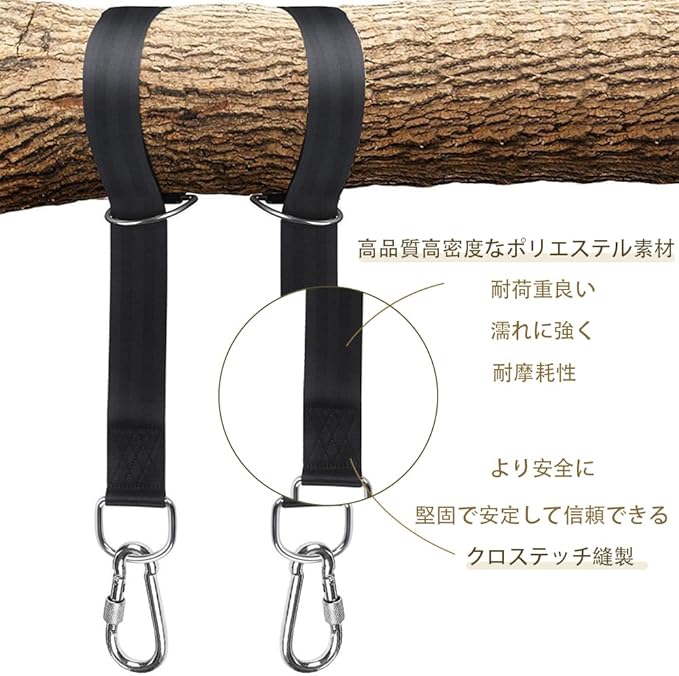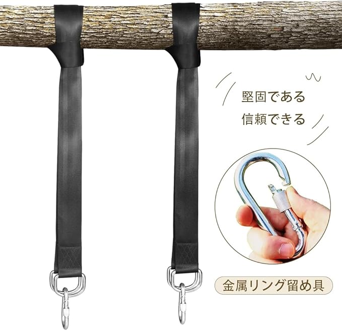 【セット内容】ブランコハンモック固定用ベルト 2、安全ロック付き カラビナ 2個、専用収納バック 1