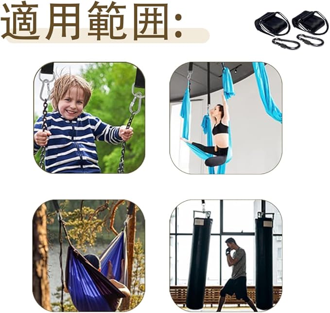 【適用範囲】ブランコ 、 吊り輪 、 ハンモック 、 エアリアル ヨガ 、 サンドバッグ などの吊り下げ式遊具に幅広くご利用いただけます。また、 固定用ベルト としてだけではなく、自動車用 の 牽引縄 や 引っ越し 時の 荷物 引き縄 としても 使用 していただけます。室内や庭、キャンプ、アウトドアなどいろんな場所で使えます。