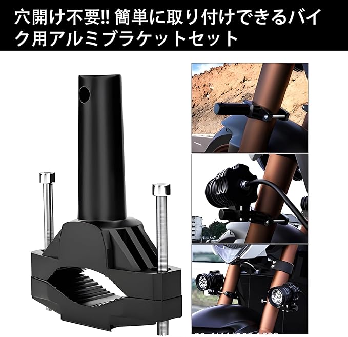 【簡単取り付け可能なアルミブラケットセット】穴開け不要で、簡単に取り付けができるバイク用アルミブラケットセットです。直径2〜5.5cmのステーに対応し、長めのボルトが付属しています