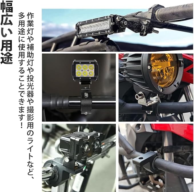 【幅広い対応範囲】アルミパイプ約22mm-30mmまで対応可能です。オートバイのバンパー等のパイプにLED作業灯・バーライト・フォグランプ・サーチライト・デッキライトなどにお使い頂けます。
