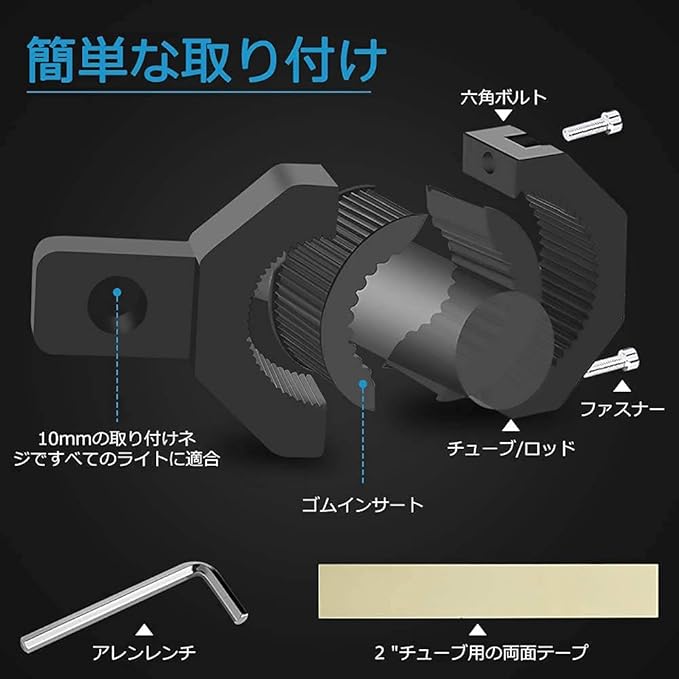 【適用範囲】汎用(16-30mm径パイプに挟み込むことが可能です) オートバイのバンパー等のパイプにLED作業灯・バーライト・フォグランプ・サーチライト・デッキライトなどを取り付けためのスタンドとしてお使いいただけます。