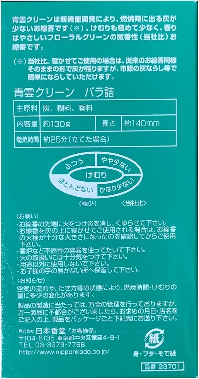 灰の少ないお線香という画期的な新機能が加わった「青雲クリーン」のバラ詰です。灰が少ないことに加えて、煙も少なく、香りもほのかなフローラルグリーンの微香性です。燃焼時間約25分(立てた場合)。