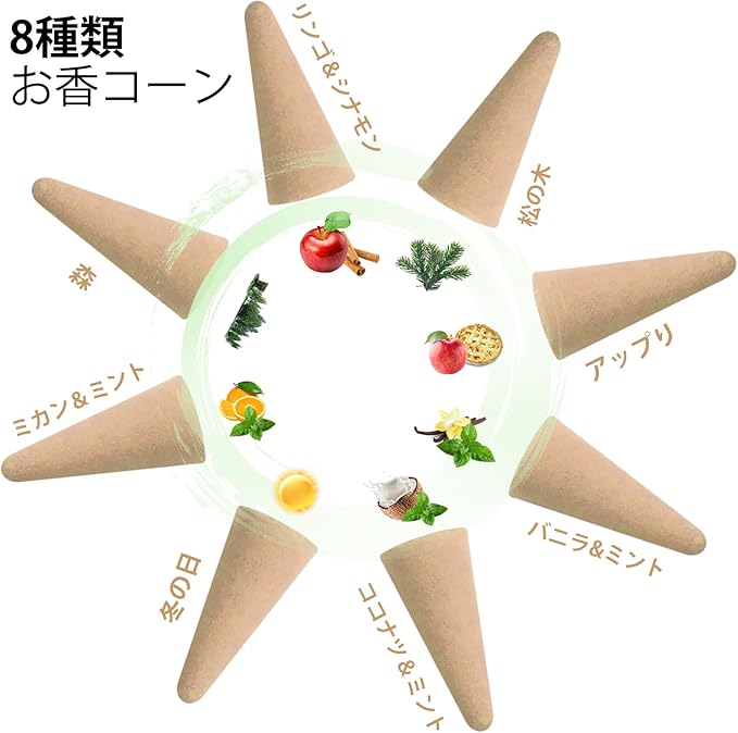 FIRIK お香コーン お香りコーン詰め合わせ アロマお香り 香りホルダー付き 香りコーンギフトセット バニラミント&ミント ココナツ&ミント 冬の日 森 ミカン&ミント リンゴ&シナモン 松の木 アップり 8種 各15個入