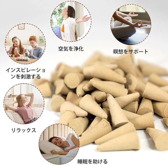 【アロマコーンインセンス】お香コーンに火をつけ、空気中に広がる香りにより、徐々にリラックスし、疲れや悩みを忘れることができます。