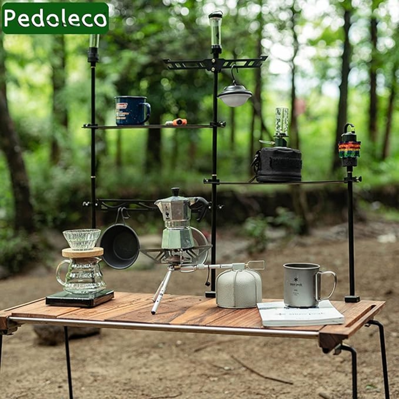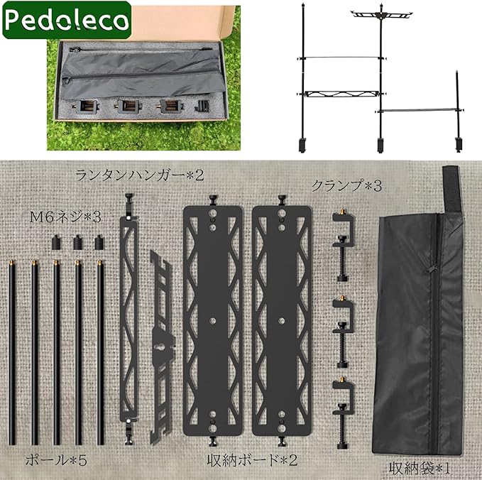 Pedoleco キャンプ用ランタンスタンド 卓上 アルミ製 折り畳める 収納袋付き 高さ調整可能 キャンプ/ビーチ/釣り/登山/遠足 クランプ式 吊り下げ 軽量 組み立て簡単 持ち運び便利 用品整理 アウトドア