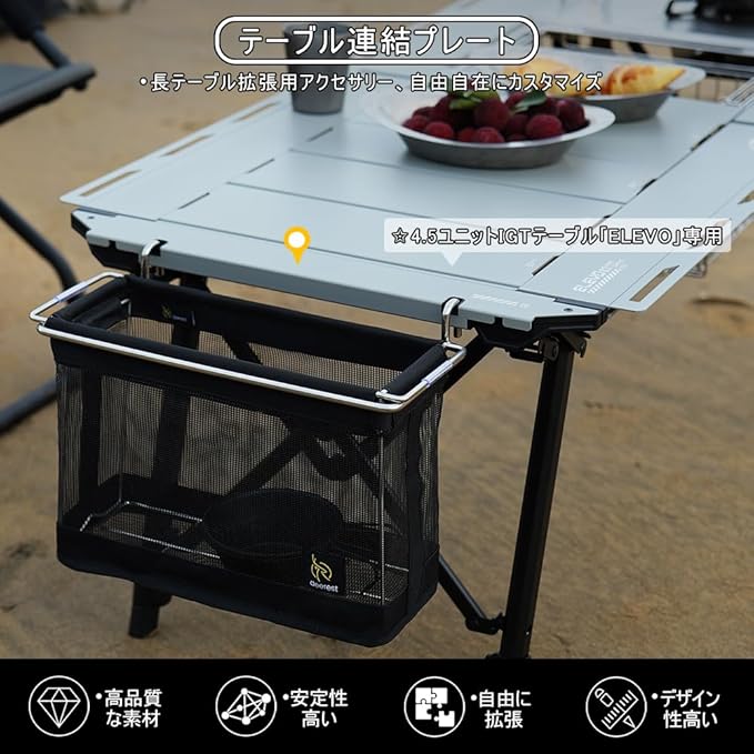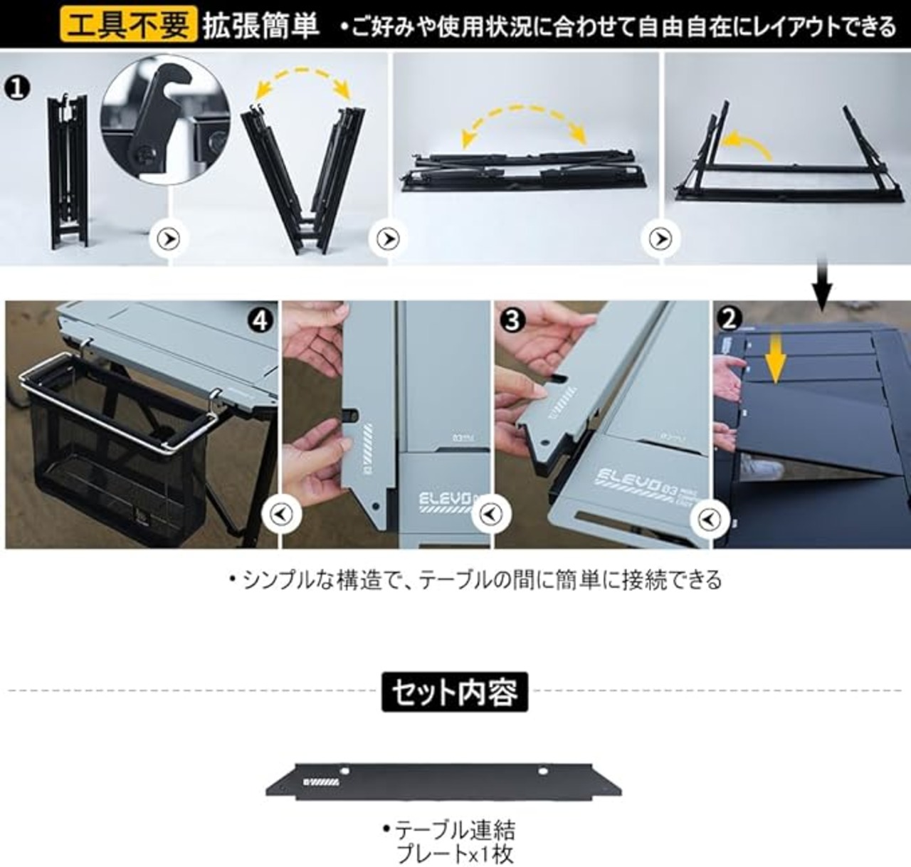 自由に拡張:テーブルの2面拡張構造に取り付け、複数のテーブルを接続可能、大人数向け広めサイズのテーブルに拡張できます。また、穴あけ加工により、水切りトレー、収納ラック、ランタンスタンドなどのアイテムを装着可能、自由に組み合わせて拡張することができます。