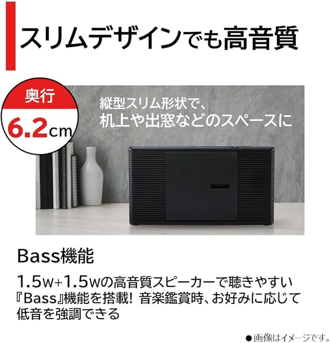 1.5W+1.5Wのスピーカー搭載でしっかり大音量で聴きやすいことに加え、「Bass」機能を搭載。音楽鑑賞時、お好みに応じて低音を強調できます
