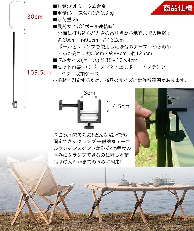 【軽量化】ランタンスタンドは3段のねじ込み式ポール+フックで設計されており、取り付けたままのサイズは132cmで、重量は約300gです。従来の4つのセクション式ランタンフックに比べて、取り付けが簡単で軽量です。必要に応じて高さを調整することができ、(打ち込み式)高さの設定範囲は60cm、96cm、132cmです。ランタンスタンド テーブルと組み合わせて使用する場合、ランタンの高さを53cm、89cm、125cmに設定できる。