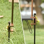 【打ち込み クランプ式】打ち込み式とクランプ式の両用タイプになっており、ペグとクリップが付き。地面に突き刺して簡単に設置できるのが魅力的で、ペグのレフロープで簡単に引き抜けます。それだけでなく、クリップ利用して、テーブル(3cm以下)でも簡単に挟んで固定できます。ハンガー部分はネジで固定し、失われることが心配なく、安定感もよくあります。