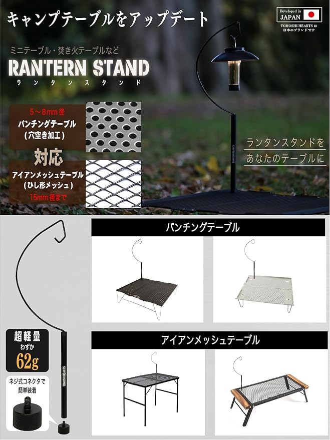 TOMOSHI HEARTS 卓上ランタンスタンド 62g パンチング アイアンメッシュに装着 ネジ式コネクタ 超軽量 コンパクト アルミ合金 キャンプ バックパック ミニテーブル用 焚き火テーブル用 トモシハーツ IGTテーブル用