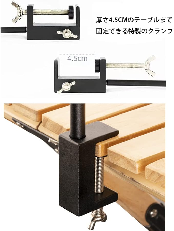 ►【耐久性&安定性】ポール全体は高強度のアルミで作られており、中空のデザインで軽量で持ち運びにやすい上に、安定性も並はずれ。外は触り心地のよい黒い粉体塗装により、高級感が溢れ、錆び難く耐久性も抜群。ステンレス材質のクランプは安定性に強く、テーブルにしっかり挟んだら、倒れる恐れはありません。