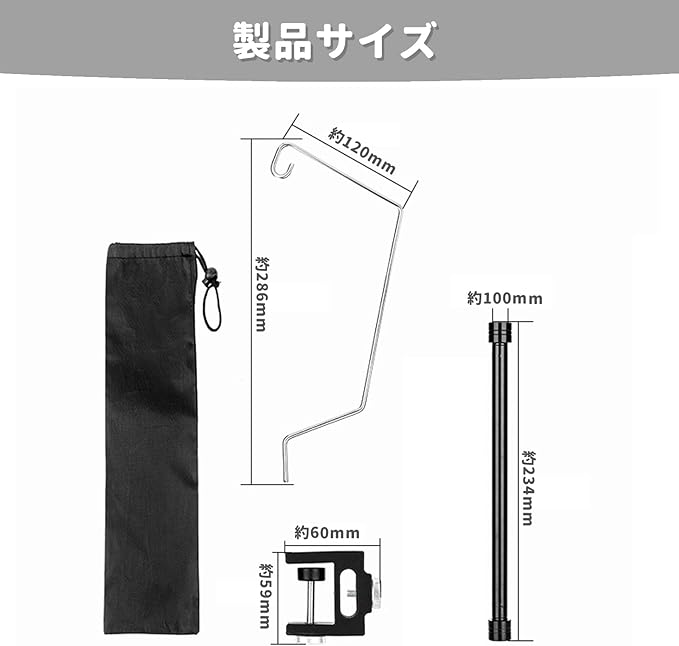 【製品構成】ランタンスタンド、収納袋、卓上クリップの3点セット。収納時は約120mm 286mmのコンパクトサイズにまとまり、専用収納袋で携帯性を確保。アウトドア活動での移動時にもかさばりません。