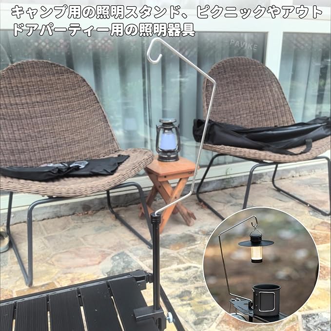 【簡単設置】ランタンスタンド 卓上用クリップ設計で、最大30mmのテーブル厚に瞬時対応。工具不要のワンタッチ操作で、キャンプサイトでもスムーズに設置可能。自立式ベースで揺れを軽減します。