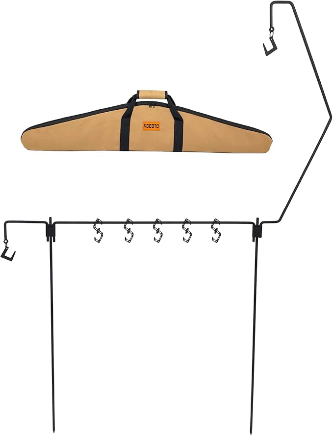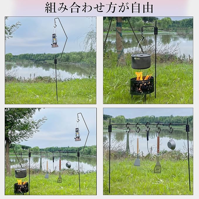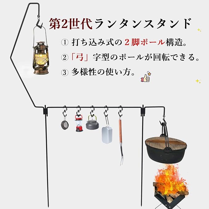 【多機能アウトドアスタンド】大きな弓フックにより1本脚タイプから2本脚ハンガースタンドへと切り替え可能で、ランタン・吊り鍋・焚き火にも対応。夜釣り、ビーチ、バーベキュー、キャンプ、公園など、幅広いシーンで活躍します。