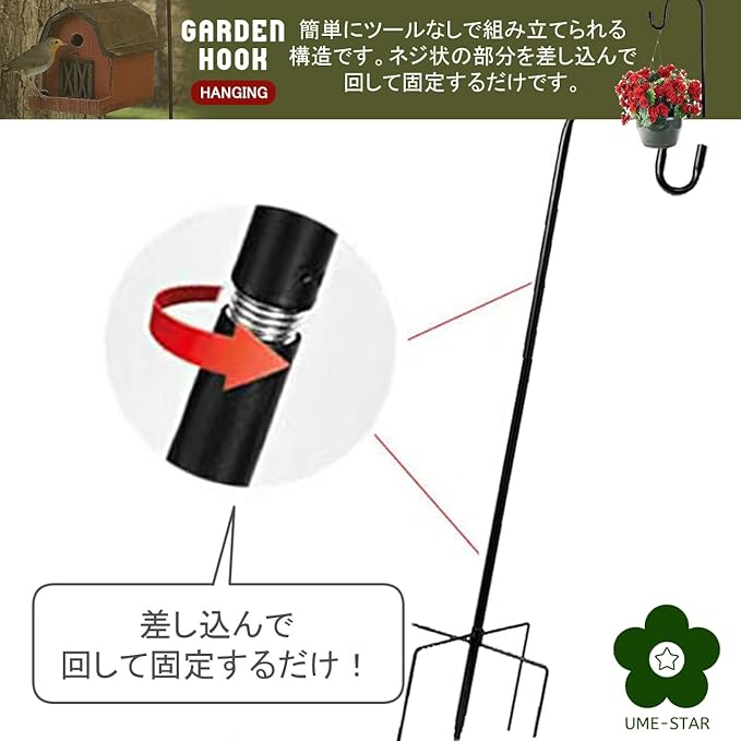ランタンや提灯、鉢植え、巣箱などを釣るしておけるガーデンシェパードフック2個セットです。 簡単にツールなしで組み立てられる構造です。ネジ状の部分を差し込んで回して固定するだけです。