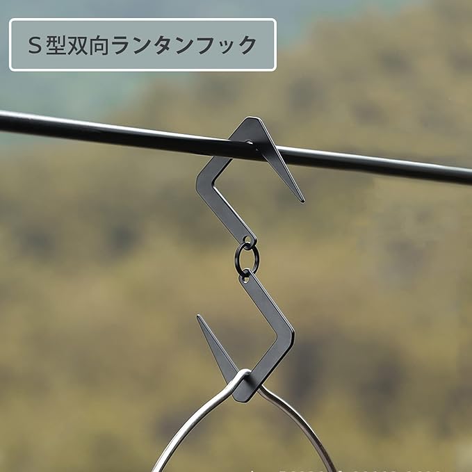 【幅広い用途】アウトドア・キャンプで活躍する金属S型フックです。ランタンポール、ハンギングチェーンやロープで使用でき、ランタン、お鍋、水ボトルや雑貨などいろいろな道具をランタンスタンドにかけることができます。なお、焚き火フックとして使って、様々なハンガーを組み合わせて使用可能でございます。キャンプ、キャンプファイヤー、バーベキュー、登山などのアウトドア活動でご活躍いただけます。
