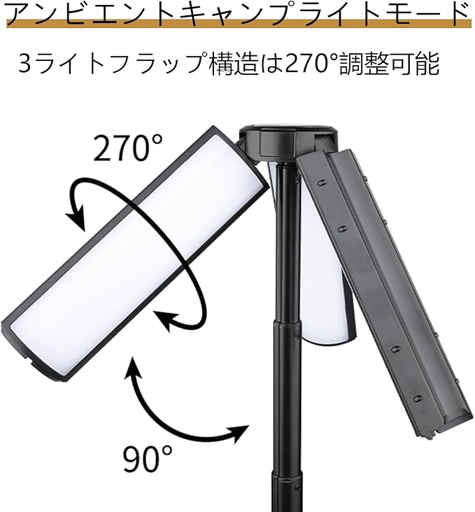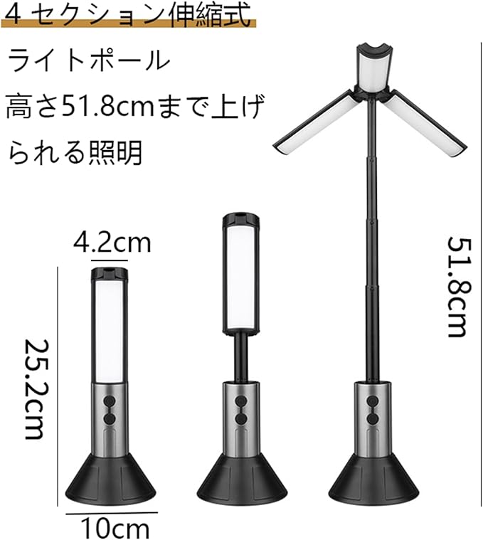 【高輝度】4セクションの伸縮式ライトポールが装備されており、高さ51.8cmまで簡単に上げることができ、遠近照明の自由な調整を実現します。白色レーザー芯と54個のLEDの組み合わせにより、明るい光と広いカバーエリアを確保します。