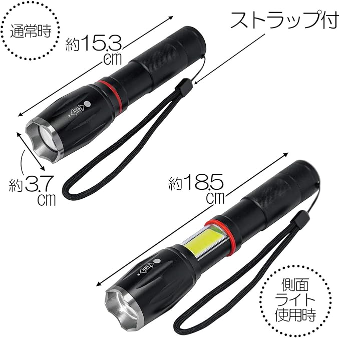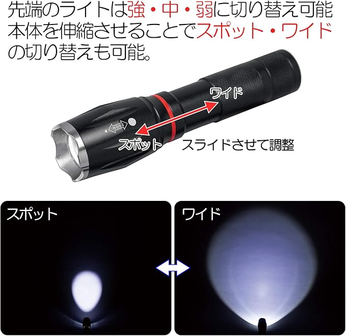 先端ライトは強・中・弱にきり替えられ、更に、本体を伸縮することでスポット・ワイドに調整可能なため、様々な用途に対応できる多機能懐中電灯です