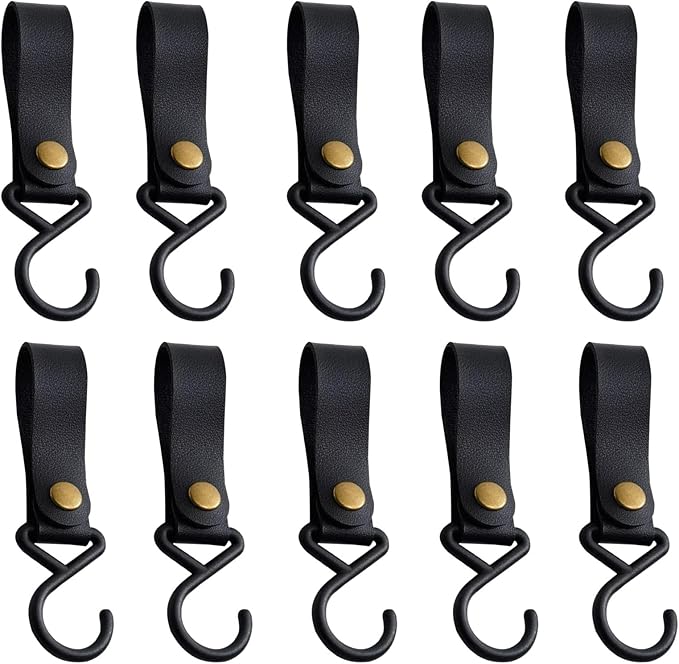 キャンプ用ハンガーフック10個セットです。PUレザーストラップ。カラーはブラックで汚れが目立ちません。スナップボタンで簡単に装着できます。