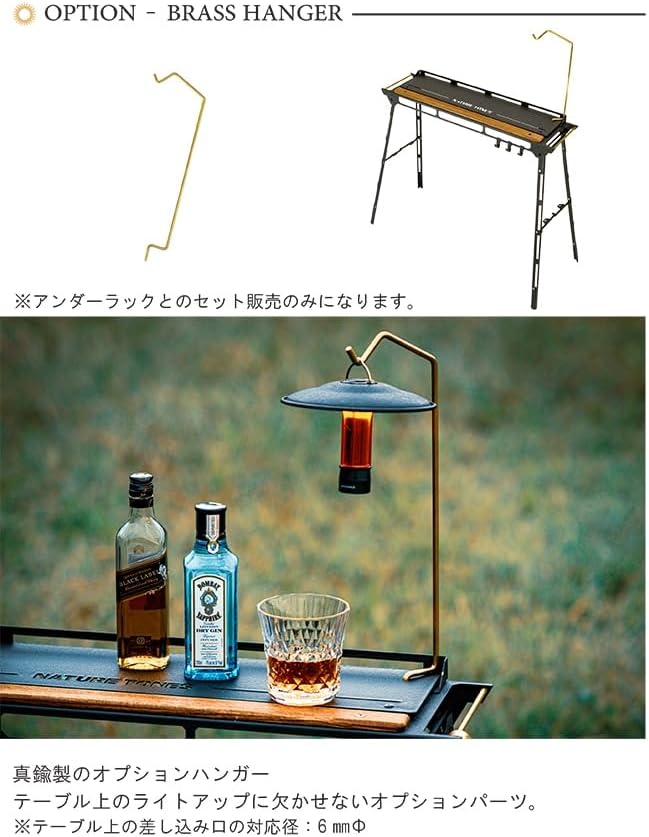 ランタンやLED置き、ミニバー等、用途は色々使えるスタンドです。サイドハンガーとフロントハンガーを搭載。専用のフックを3個、本体の付属品として用意。フロントハンガーにセットして使用することが可能。天板の裏側には第三の隠れた「センターハンガー」を搭載。S字フックなどで小物を吊るして置くことができLEDを吊るすことでオプションアンダーラックを照らす間接照明のような使い方も可能です。