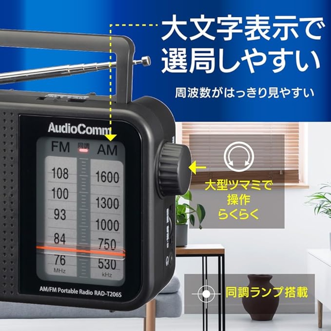 オーム(OHM)AudioComm ラジオ 卓上 AM/FMポータブルラジオ コンセント 乾電池 2電源 大文字表示で見やすい ワイドFM 防災ラジオ RAD-T206S 03-0986 オーム電機