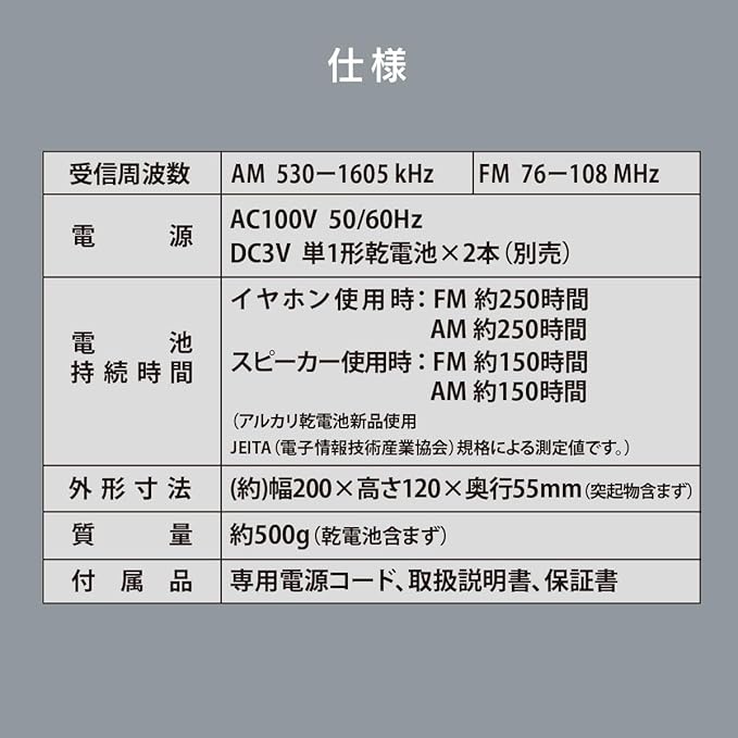 【 仕 様 】 ◆受信周波数:AM…530-1605kHz、FM…76-108MHz ◆電源:AC100V 50/60Hz、DC3V 単1形乾電池 2本(別売) ◆電池持続時間:※アルカリ乾電池新品使用 イヤホン使用時…FM受信/約250時間、AM受信/約250時間 スピーカー使用時…FM受信/約150時間、AM受信/約150時間
