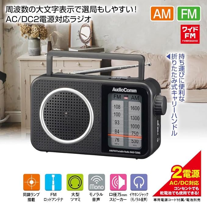 ◆ワイドFM(FM補完放送)対応 ◆同調ランプ搭載 ◆FMロッドアンテナ付き ◆大型ツマミ ◆モノラル音声 ◆口径75mmスピーカー ◆イヤホンジャック(モノラル音声)