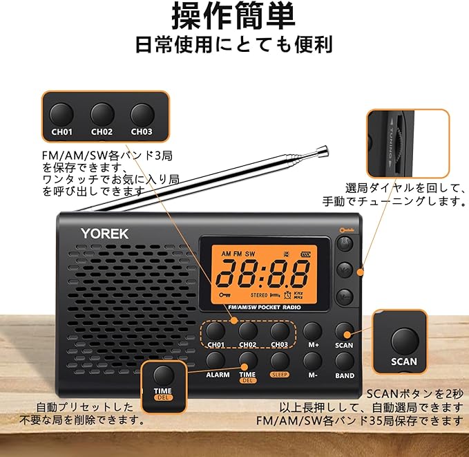 自動選局&お気に入り局:本機はオートスキャン機能を搭載しております、お使いの地域で受信可能な放送局を一括してメモリー登録できます。FM/AM/SW各バンドで35局保存できます。また、FM/AM/SW各バンドについてお気に入り局を3局保存できます、ワンタッチで保存したお気に入り局を呼び出しできます。日常使用にとても便利です。選局ダイヤルも付きます、回すだけで簡単にご選局もできます。