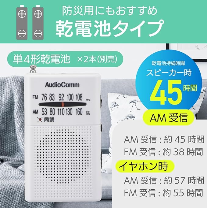 ・イヤホン使用時…AM受信/約57時間、FM受信/約55時間