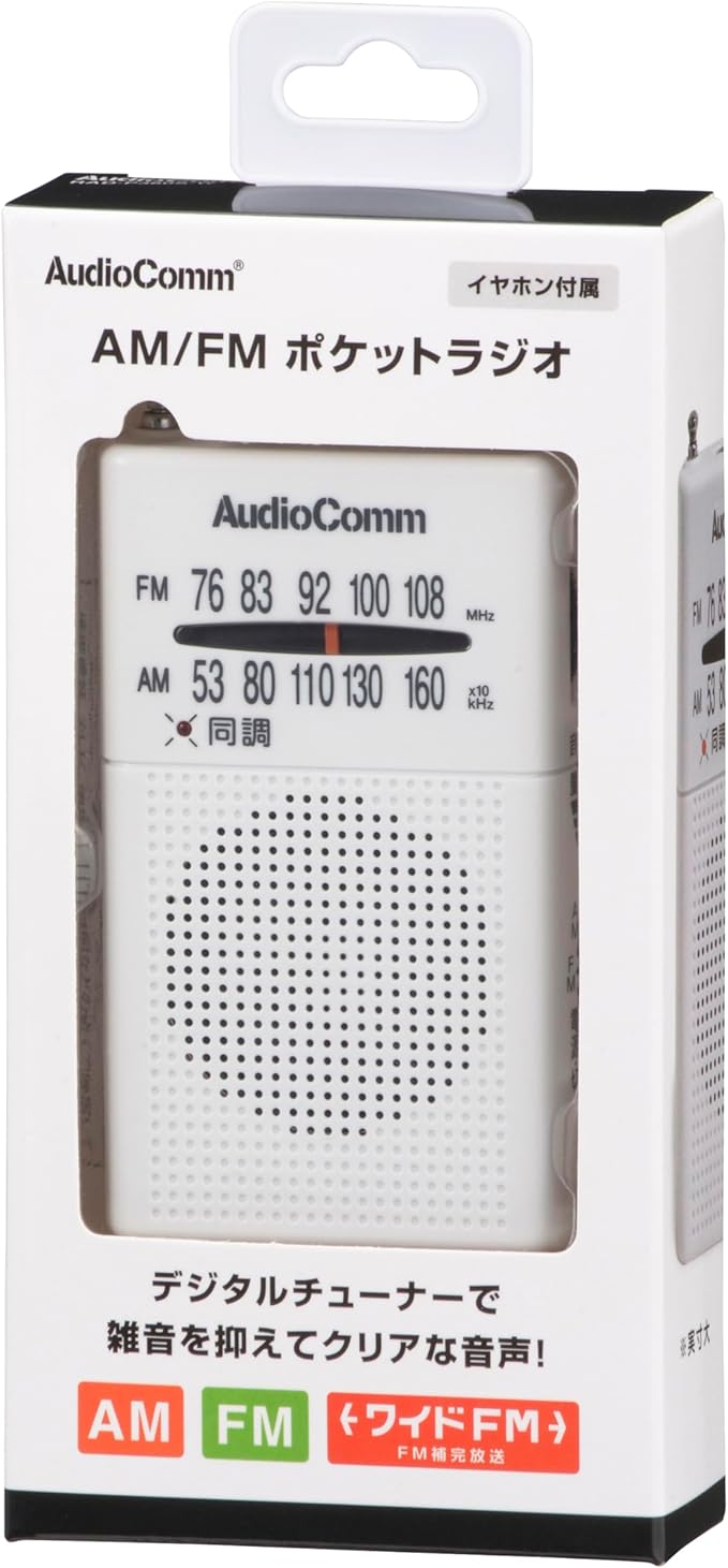 【 特 長 】 ◆ デジタルチューナーで雑音を抑えてクリアな音声 ◆ ワイドFM(FM補完放送)対応 ◆ 同調ランプ付き ◆ FMロッドアンテナ ◆ モノラル受信 ◆ イヤホン付属 ◆ 本体カラーはホワイト【 仕 様 】 ◆ 受信周波数:AM…530~1605kHz、FM…76~108MHz ◆ 電源:DC3V 単4形乾電池 2本(別売) ◆ 電池持続時間:※アルカリ乾電池新品使用 ・イヤホン使用時…AM受信/約57時間、FM受信/約55時間 ・スピーカー使用時…AM受信/約45時間、FM受信/約38時間 ◆ 外形寸法:(約)幅55 高さ92 奥行19mm(突起物含まず) ◆ 質量:約61g(乾電池含まず) ◆ 付属品:片耳イヤホン(インピーダンス32Ω、 長さ約1.1m)、取扱説明書、保証書