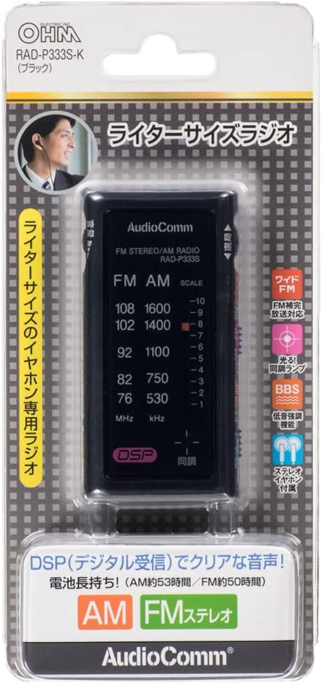 オーム(OHM) 電機 ラジオ 小型 ポータブルラジオ ポケットラジオ AudioComm ライターサイズラジオ イヤホン専用 ブラック RAD-P333S-K 03-0969