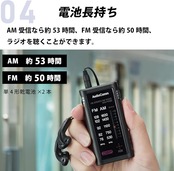 ■ 乾電池持続時間(アルカリ乾電池新品使用):AM受信…約53時間、FM受信…約50時間