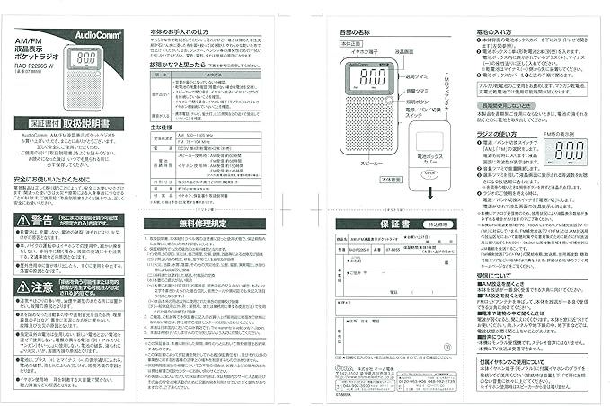 【 特 長 】 ● AM/FM、ワイドFM(FM補完放送)対応 ● 液晶画面は大文字表示、バックライト付で見やすく選局がしやすい。 ● FMロッドアンテナ ● モノラル受信 【 仕 様 】 ■ 受信周波数:AM/530~1605kHz、FM/76~108MHz ■ 電源:DC3V 単4形乾電池 2本(別売) ■ 電池持続時間: スピーカー使用時…AM受信/約40時間、FM受信/約42時間 イヤホン使用時…AM受信/約53時間、FM受信/約55時間 ※アルカリ乾電池新品使用、JEITA(電子情報技術産業協会)規格による測定値です。 ■ 外形寸法:幅55 高さ92 奥行21mm(突起物含まず) ■ 質量:約72g(乾電池含まず) ■ 付属品:イヤホン、保証書付取扱説明書