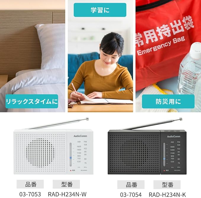 【 仕 様 】 ◆電源:DC3V 単3形乾電池 2本(別売) ◆受信周波数:AM…530~1605kHz、FM…76~108MHz ◆スピーカー:口径50mm 1(8Ω) ◆乾電池持続時間:・ スピーカー時…AM受信/約31時間、FM受信/約32時間・ イヤホン時…AM受信/約73時間、FM受信/約75時間