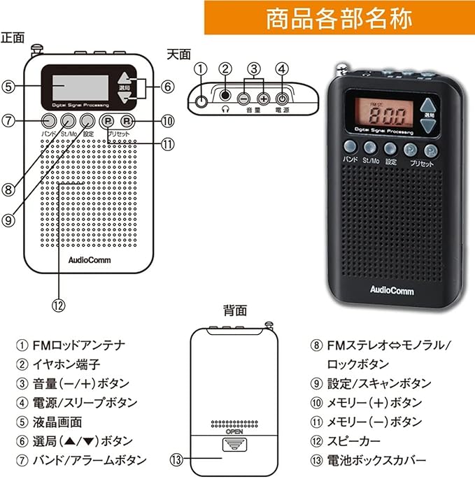 音量もデジタル表示 AM/FM各20局を自動でメモリーできる自動選局&保存機能付 時計・アラーム・スリープ機能付 ワイドFM対応 FMロッドアンテナ付 誤作動防止ロック機能付 スピーカー搭載・ステレオイヤホン付属