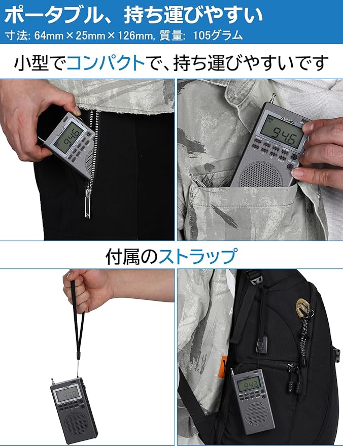 「持ち運びやすい」このポータブルラジオは126*64*25mmとコンパクトです。コンパクトなサイズなので持ち運びしやすく、緊急時にカンタンに使用可能。更にストラップを備えて、便利に手に掛けたりできます!