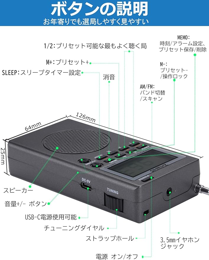 ★片手で持てるサイズで、ボリューム、チューニングダイヤル、電源ボタンが右側に配置してあるので 右手で持ったまま全ての操作が出来ます。