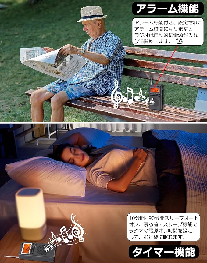 【アラーム・タイマー・クロックラジオ】アラーム機能は目覚まし代わりに使えて毎朝ラジオの声で目覚めます。スリープタイマー機能は消えるまでの時間を設定(10分~90分)できるので、安心して寝られます。大きな文字で見やすいデジタル時計を搭載。