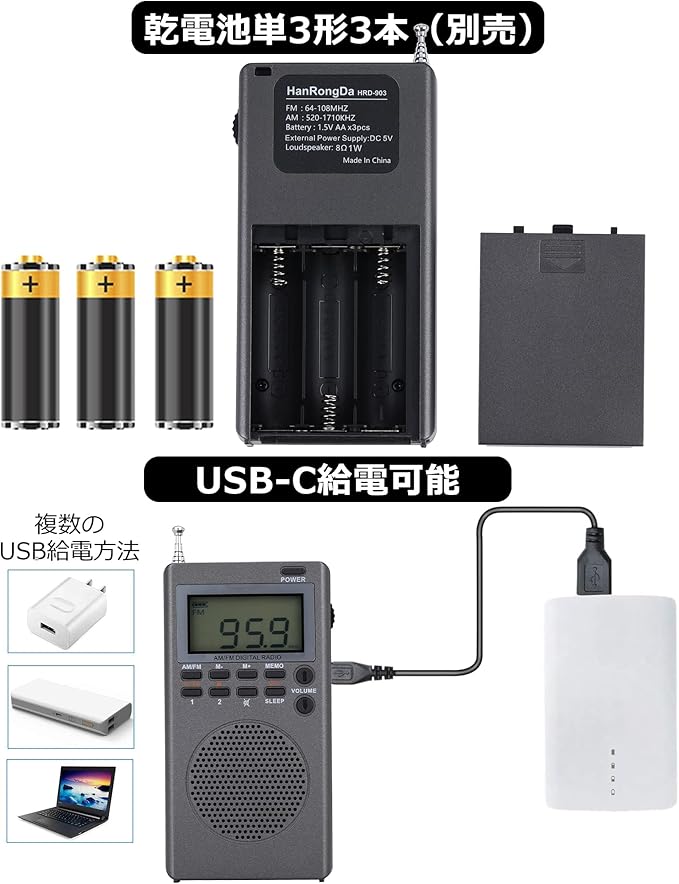 【USB給電可能・電池式ラジオ】USB-Cケーブル(付属)と単3形乾電池3本(別売)両方とも給電できます。電池が切れた時に付属したUSB-Cケーブルを利用して、ラジオと繫がってパソコンやモバイルバッテりなどうUSB給電元からラジオに給電できます。