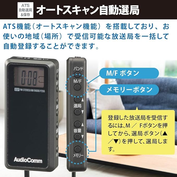 【 特 長 】 ◆本体約30gの軽量ミニサイズでお出かけや通勤に便利 ◆選局しやすいデジタル表示、液晶ディスプレイ ◆ATS自動選局、AM/FM各30局メモリー登録 ◆ノイズが少ないDSPデジタル高感度受信
