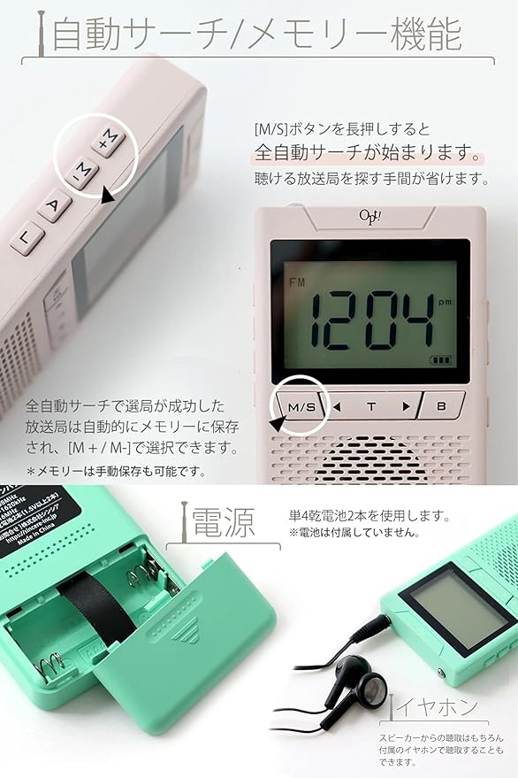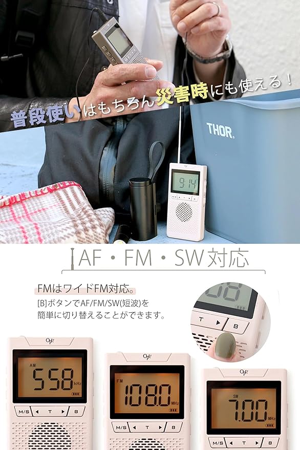 【コンパクトだけど、多機能】■時刻表示 ■FM/AM/SW ラジオ:災害時はもちろん日常もラジオとしてご使用いただけます。 ■アラーム&スヌーズ: ■イヤホン機能:付属のイヤホンを使用してラジオを聴くことができます。FMラジオに限りステレオサウンドで聴くことができます。 ■スリーブ機能 ■低電圧シャットダウン機能