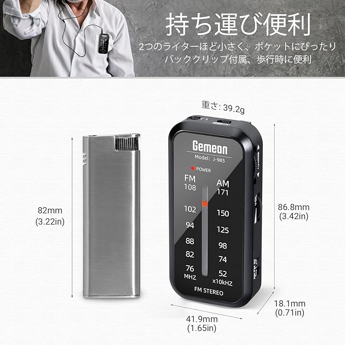 【ポケットサイズのミニラジオ】小さなポケットラジオはわずか41.9 x 18.1 x 86.8mmのサイズで、重さは40g(電池別)。FMポケットラジオは2つのライターのサイズくらいで、ポケットにほとんどスペースを取りません。ポケットクリップラジオはポケットにクリップできるため、ランニング、サイクリング、ガーデニング、旅行に非常に便利です。