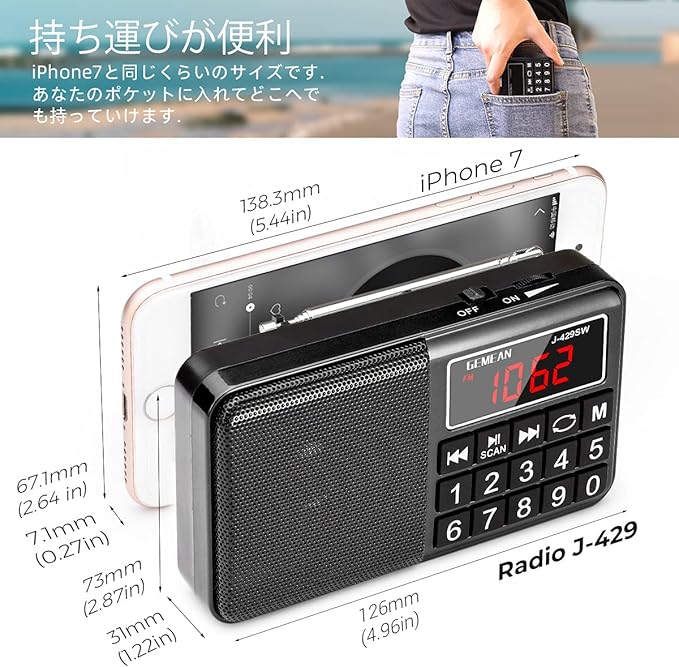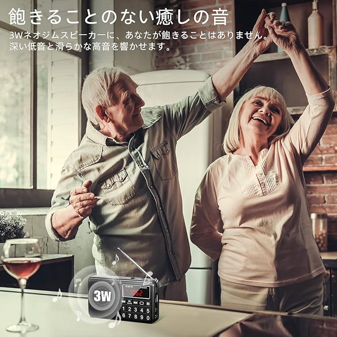 高音質ファン向け: 1) ラジオ sdカード対応/USBドライブ をサポートします(0-32GB )。追加のMP3機能があることを意味します。 2) AUX機能付き。簡単にあなたの携帯電話やコンピュータのスピーカーとしてラジオを使用することができます。 3) 信頼性の高い低音と滑らかな高音を 提供する3W内蔵磁気スピーカーを搭載。また、充電式ラジオなので、バッテリーの無駄を気にすることなく、高音質の音楽を存分に楽しむことができます。