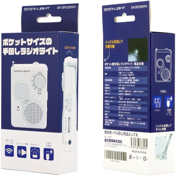 コンパクト設計:ポケットに入るサイズの手のひらラジオ。持ち歩きやすく、通勤・散歩・旅行などにも最適。 手回し充電対応:USB Type-Cに加え、手回しでも充電可能。停電・災害時にも安心して使用できます。 LEDライト搭載:手元を照らすLEDライトは、強・弱・点滅の3モード切替式。非常灯としても活躍。 多機能ラジオ:FM(76.0~108.0MHz)・AM(522~1620kHz)対応、ワイドFMも受信可能。 イヤホン端子付き:周囲に音を出さずにラジオを楽しめる、φ3.5mmミニジャック対応。 軽量モデル:小型・軽量設計で、防災バッグやカバンに常備しやすい携帯用ラジオライト。
