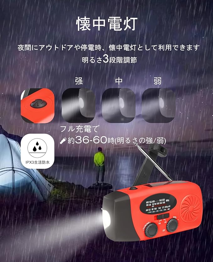 【電池残量表示 PX3防水 イヤホン端子】バッテリー残量を4段階で表示します。バッテリー残量が一目で分かるインジケーター、電池残量を細かく把握できます。●【高輝度懐中電灯】高輝度のLEDライトを内蔵された充電式ライト、キャンプ、ハイキング、またはその他の野外活動での夜間の視認性を大幅に向上させます。●【IPX3防水】このラジオは生活防水を満たしています。(完全に水に浸さないでください)。イヤホン端子付きますので、アウトドアでノイズが大き声の環境で、ヘッドフォンを通じてクリアな音質を得ることができます。コンパクトなデザインで、バッグに入れて収納するのに便利です。防災用品の予備として、日常生活でも非常時でも使える防災ラジオです。