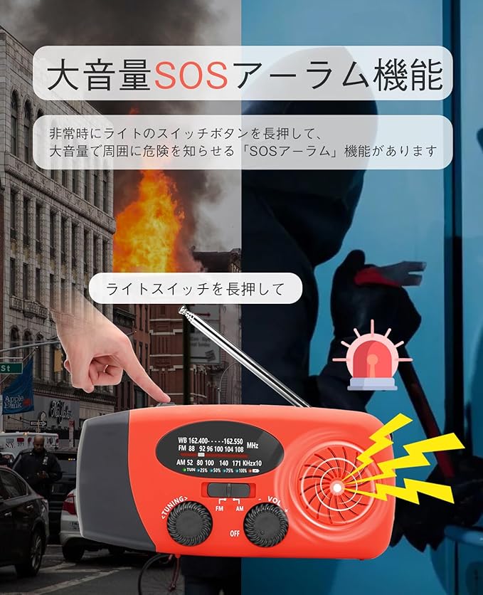 懐中電灯 SOSアラーム 多機能防災ラジオ ♂ :この多機能ラジオは、コンパクトのデザインで、ラジオの情報を受信するだけでなく、LEDライトが付いています。夜間や停電時LEDライトのスイッチボタンを押すと、懐中電灯として利用できます。他には、防犯ブザーのSOSアーラム機能があります。ライトのスイッチボタンを長押して、大音量アラームが警報音の伝播をより遠くにして、危険と突発状況に遭遇した場合、この機能を使用して周囲の人の注意を引き起こして助けを得ることができます。夜間にアウトドアのキャンプやランニングや釣りが好きな人たちには、素晴らしい装備品です。