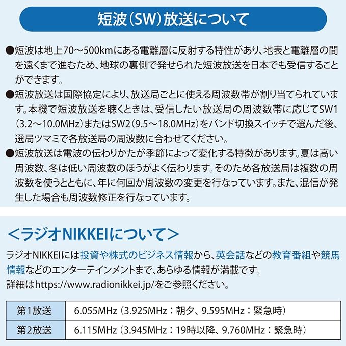 【 特 長 】 ◆短波/AM/FMの3バンドが受信できるポータブルラジオ ◆競馬中継や株式情報が聴ける「ラジオNIKKEI」が受信できます ◆大きめ選局表示で操作もかんたん