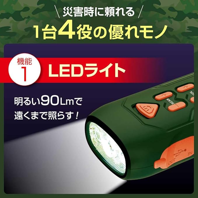 【日本企業が開発・日本語パッケージ】多機能搭載|LEDライト・AM/FMラジオ・スマホ充電、明るさ約25ルーメンのLEDライトを搭載。AM(520~1620kHz)/FM(76~108MHz)のラジオを受信可能で、情報収集に最適。さらにUSB出力でスマートフォンの充電にも対応。防災用LEDランタン、スマホ充電機能を一台に集約した多機能防災ラジオです。