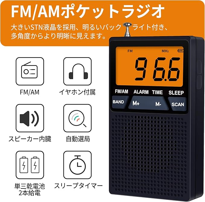高感度受信&大文字表示:高性能DSPデジタルチューナー搭載のFM/AMポケットラジオです。大きいSTN液晶を採用、明るいバックライト付き、大文字表示、多角度からより明晰に見えます。