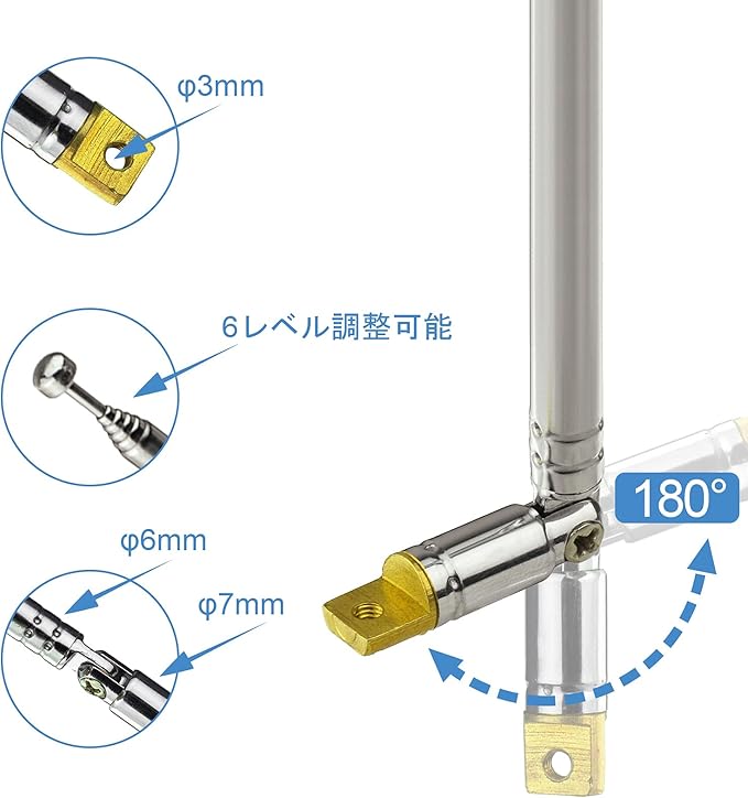 ステンレスと真鍮製の6段伸縮式アンテナ、アンテナの長さ:16cm~65cm、取り付け穴の直径:2.5mm。